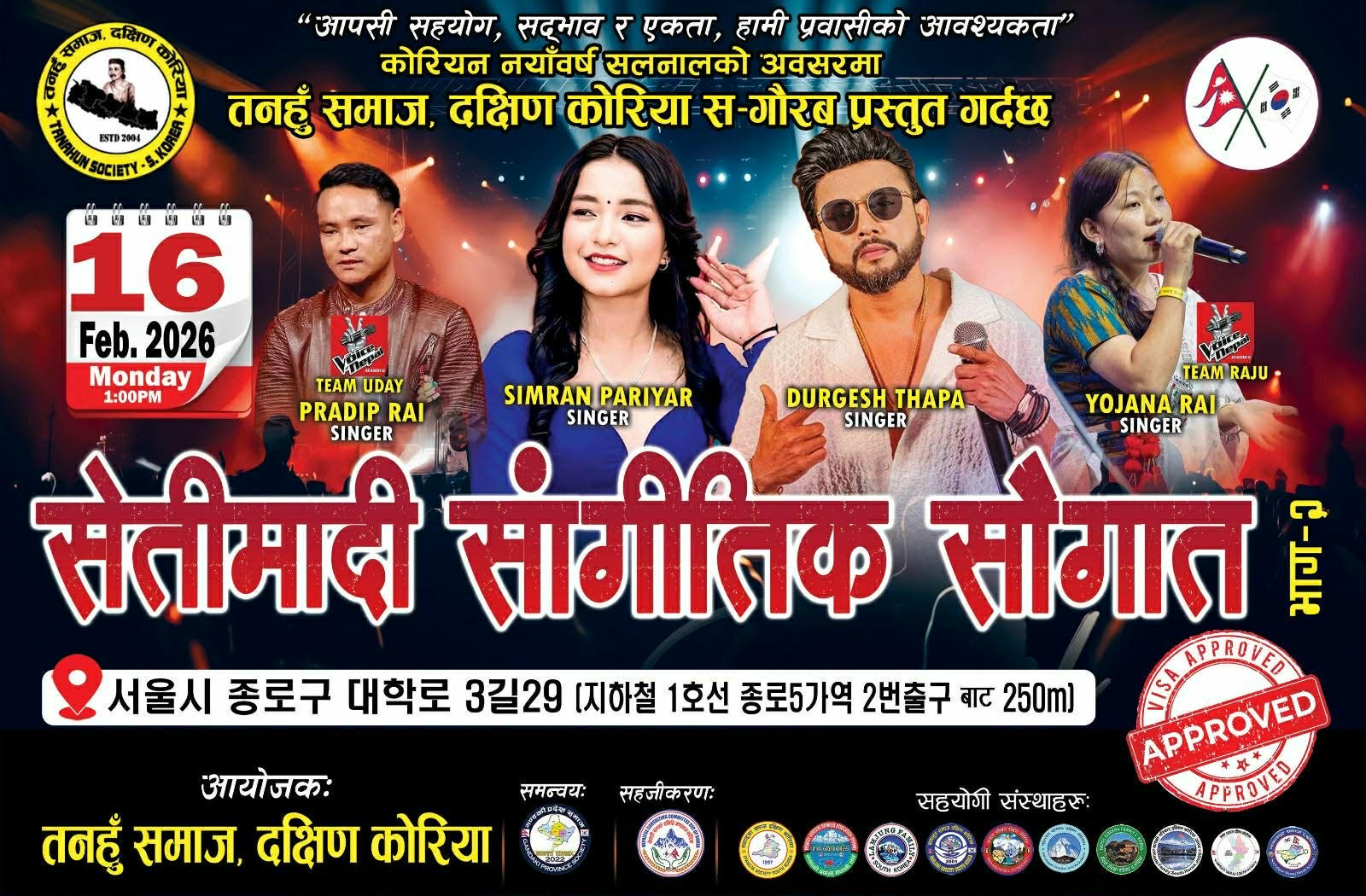 दक्षिण कोरियामा रहेका नेपाली समुदायबीच आपसी सहयोग, सद्भाव र एकता अभिवृद्धि गर्ने उद्देश्यका साथ कोरियन नयाँ वर्ष सलनाल २०२६ को पावन अवसरमा तनहुँ समाज, दक्षिण कोरिया ले भव्य सांगीतिक कार्यक्रम “सेती–मादी सांगीतिक सौगात भाग–२” आयोजना गर्ने भएको छ।