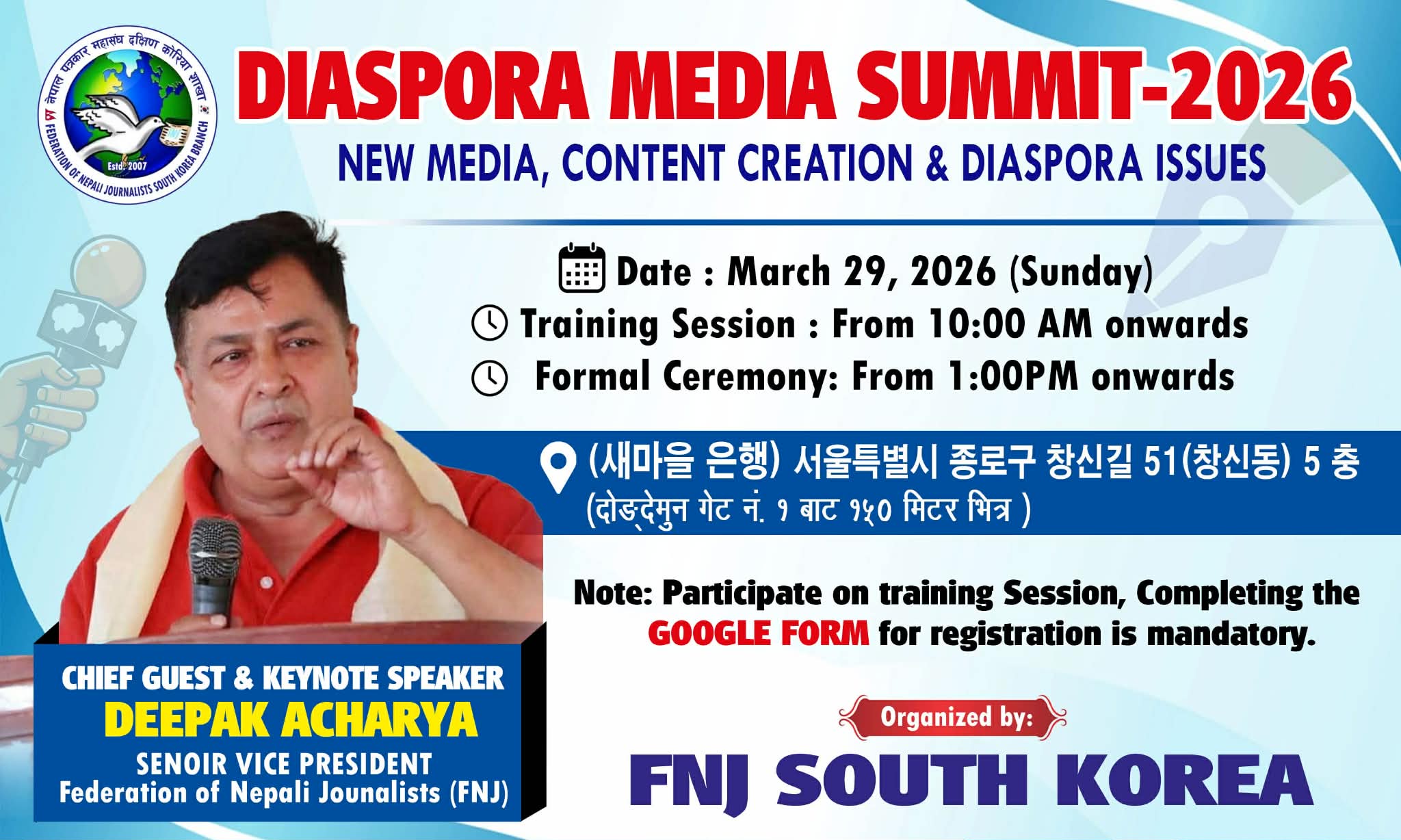 दक्षिण कोरियामा रहेका नेपाली सञ्चारकर्मी तथा सञ्चारप्रेमीलाई एकै थलोमा जोड्दै प्रवासी पत्रकारिताको सुदृढीकरण साथै क्षमता अभिवृद्धि गर्ने उद्देश्यका साथ नेपाल पत्रकार महासंघ दक्षिण कोरिया शाखाले एक विशेष कार्यक्रम आयोजना गर्ने भएको छ। आगामी मार्च २९ का दिन दक्षिण कोरियाको राजधानी सौल स्थित दुङ्देमुन क्षेत्रमा रहेको सेमाउल बैंक भवनको पाँचौँ तलामा उक्त कार्यक्रम सम्पन्न हुने आयोजकले जनाएको छ।