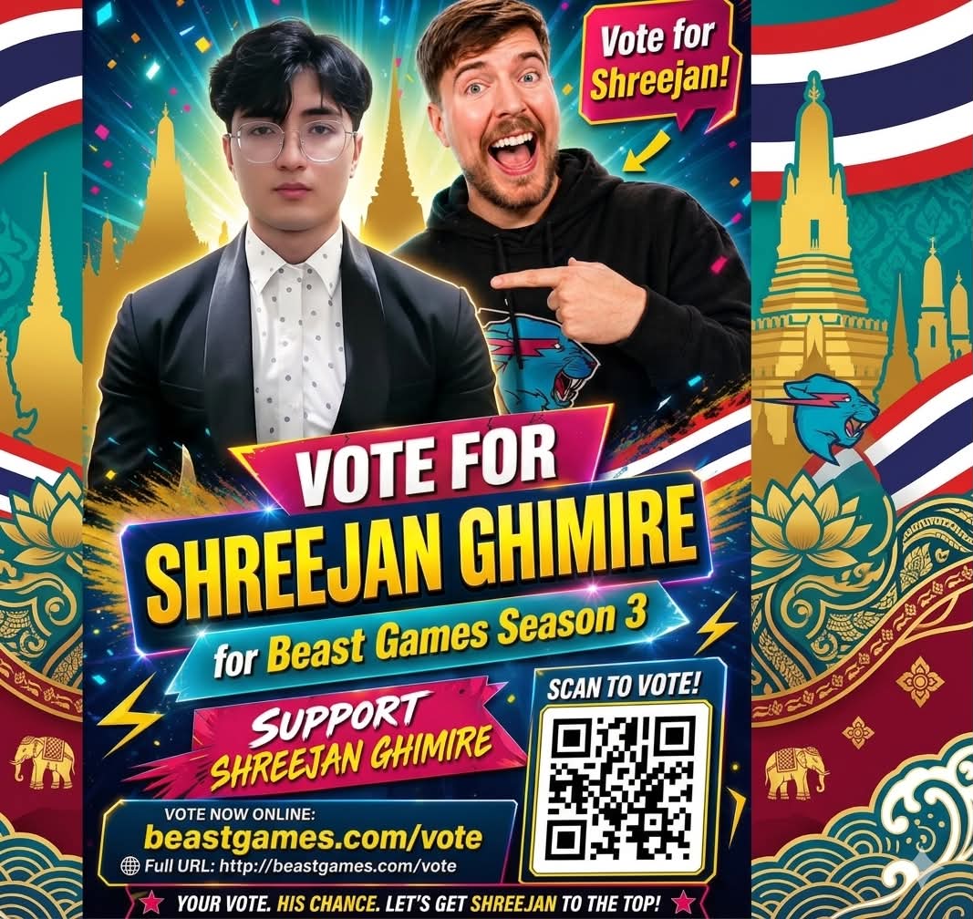 नेपाली २० वर्षीय युवा खेलाडी श्रीजन घिमिरे, जसको जरा नेपाल र थाइल्यान्ड दुवै देशसँग जोडिएको छ, अमेरिकाको नर्थ क्यारोलिनामा आयोजना हुन गइरहेको बहुप्रतिक्षित 'बिस्ट गेम्स सिजन ३' (Beast Games Season 3) मा प्रतिस्पर्धा गर्ने तयारीसँगै चर्चाको शिखरमा छन्। यस प्रतियोगिताका विजेताले ५० लाख अमेरिकी डलरको विशाल पुरस्कार हात पार्नेछन्।